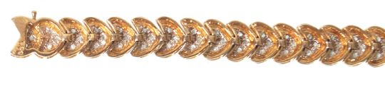 A hallmarked 9ct gold and diamond wishbone diamond bracelet. Each link being wishbone shaped inset with diamonds totalling 1ct. Hallmarked and marked 1.00. Total weight 13.4g / Length 18.5cms.