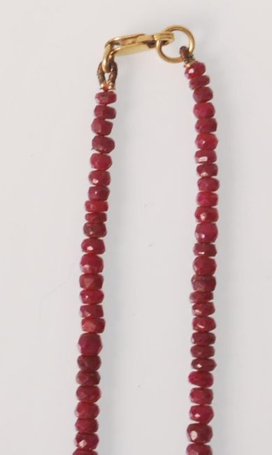 A beaded necklace of graduating faceted rubies having a 9ct gold lobster clasp. Measures 18 inches.