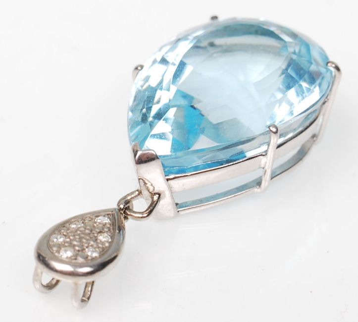 A hallmarked 18ct white gold topaz and diamond pendant. The pendant set with a large pear mixed cut blue topaz surmounted by a bale set with six round brilliant cut diamonds. Mount hallmarked Sheffield 2002. Measures 4.5cm high. Topaz measures approx 30mm x 20 mm x 12mm. Weight 18.8g.