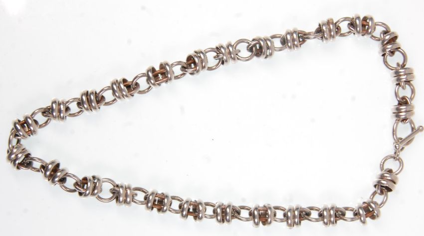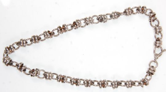 A Links Of London style silver necklace having round links with double rings throughout and a T-Bar clasp. Stamped 925. Weighs 76g. Measures 15 inches long.