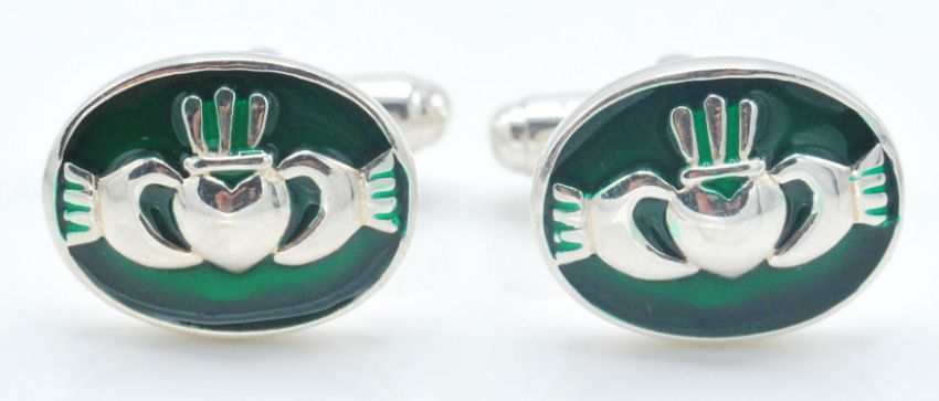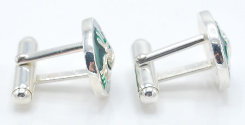 A pair of stamped 925 silver gentleman's cufflinks having blue enamelled Claddagh design oval heads. Weight 9.0g. Heads measure 1.5cm wide.