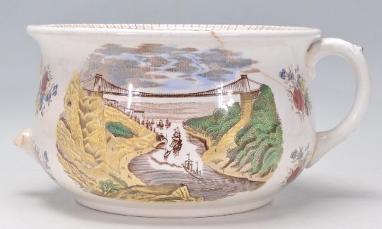 A 19th Century Victorian humorous pottery chamber pot. The interior decorated with two figures in a turnstile inscribed " One at a time if you please " and one saying " Oh my golly " the other " Oh my back ", the sides decorated with views of the Bristol Clifton Suspension Bridge, the base decorated with child seated in a chair inscribed "Number 1 - Our Early Days - Now I'm Grandfather".