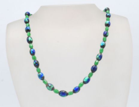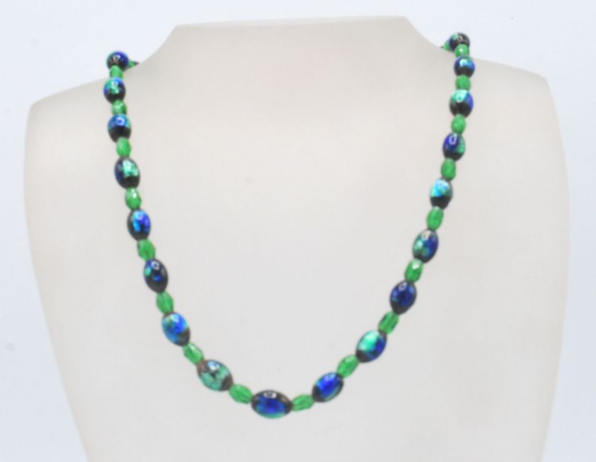 A vintage Art Deco 1930's glass beaded necklace having alternate 'peacock eye' foil beads and faceted green glass beads. Measures 19 inches.