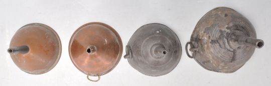 A group of four wine funnels dating from the 18th Century to include two pewter examples and two copper funnels. 16cm tall.