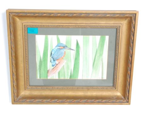 Roy Gamblin - A watercolour painting of a kingfisher bird with grass blades to the background. Signed to the bottom right in pencil Roy Gamblin. Set within a decorative gilt frame and being glazed. 38cm x 50cm