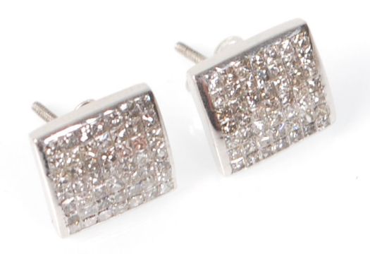 A pair of 14ct white gold ladies earrings having square heads set with a cluster of square cut diamonds. Diamonds estimated at approximately 1.25ct's. Weight 2.3g. Heads measure 4mm wide.