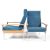 A pair of 1970's retro easy armchairs in chrome and oak. Raised on square tubular metal frames with blue original woollen upholstered seats flanked by oak flash work elbow supports. Measures 94cm x 67cm x 71cm