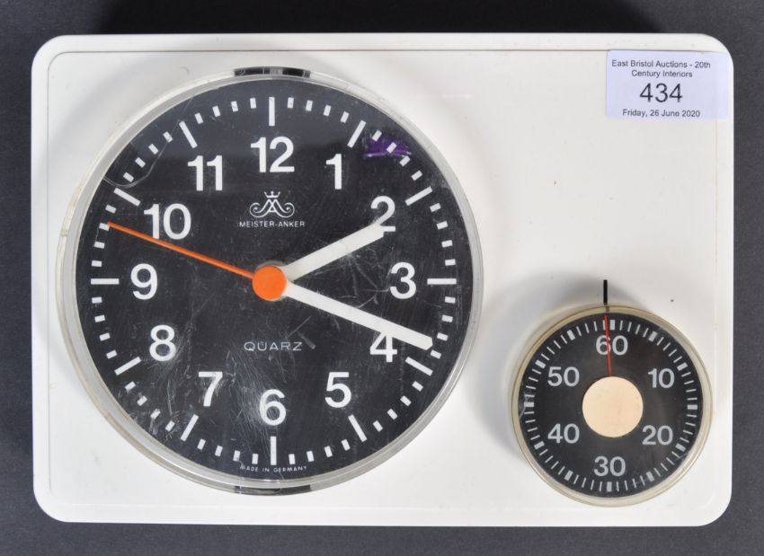 Meister Anker - A mid century, circa 1970's retro German Meister Anker quartz wall clock and subsidiary seconds dial. White plastic injection cast body with black dials  having baton hands having makers marks to centre. Measures approx; 16cm x 22cm x 16cm