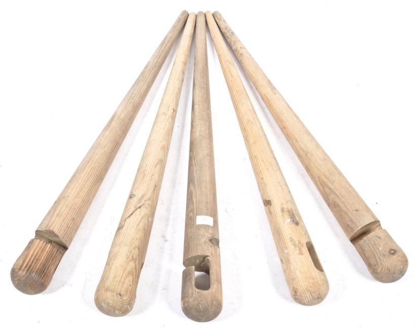 A set of unusual hand carved wooden needles, all of tapering form having originally been made for a Levi's Jeans television advertisement. The large pins / needles with tapering form and carved ends. Measures 90cm x 10cm x 10cm