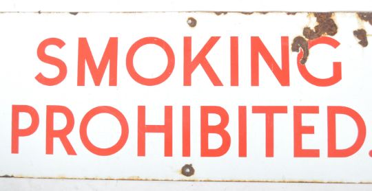 An early 20th century ' Smoking Prohibited ` Industrial warning sign. Of rectangular shape with enamel painted facia in white ground with red notation. Measures 31cm x 92cm