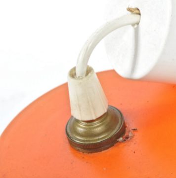 An original retro vintage mid century French orange and white glass cylindrical ceiling light shade. Orange and white ribbed bank with gilt metal lamp fitting and ceiling rose atop. Measures 20cm x 14cm, approx.