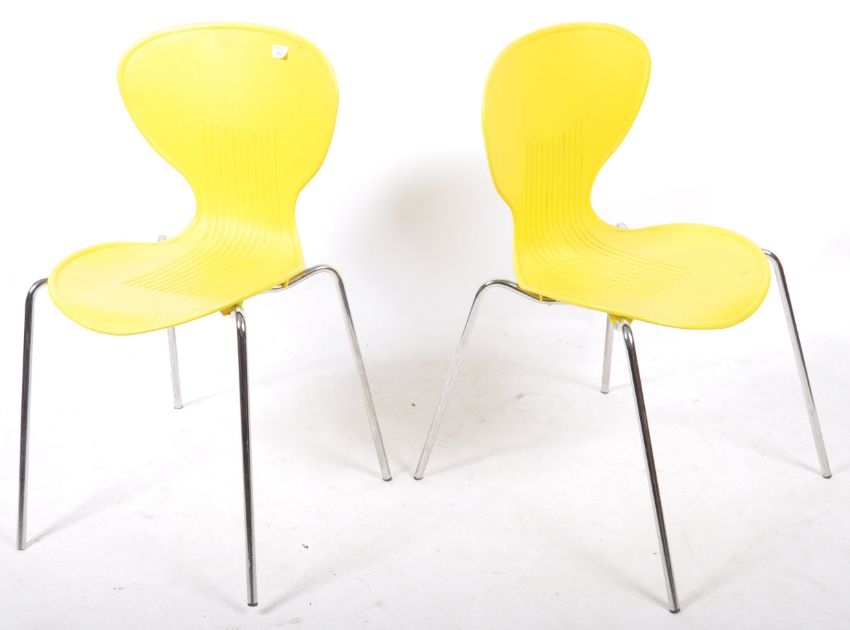 After Fritz Hanson for Frovi. A set of 2 plastic mould injection lemon green ' ant chairs ' chairs / dining chairs being raised on tubular metal chrome frames. Measures: 82cms high x 48cms wide x 53cms deep.