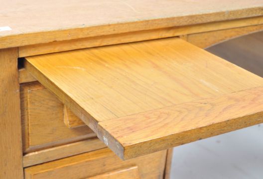 A mid century industrial / school twin pedestal desk in solid honey oak being raised on square tapering legs with twin drawers raised either side of a central kneehole recess. Complete with pull out paper slides above the drawers and with a flared edge rectangular desk top above.  Measures 76cm x 130cm x 78cm