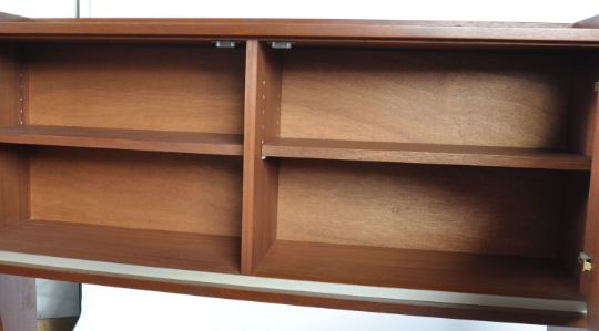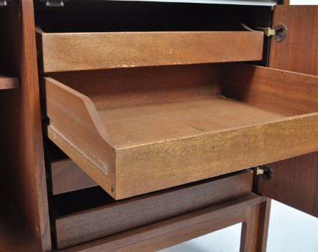 Danish Mid Century Design - A mid century retro teak wood room divider bookcase. Raised on squared legs with double door cupboard enclosing shelving and drawer within. Above, a further suspended cabinet with sectional interior for Penguin books. Measures