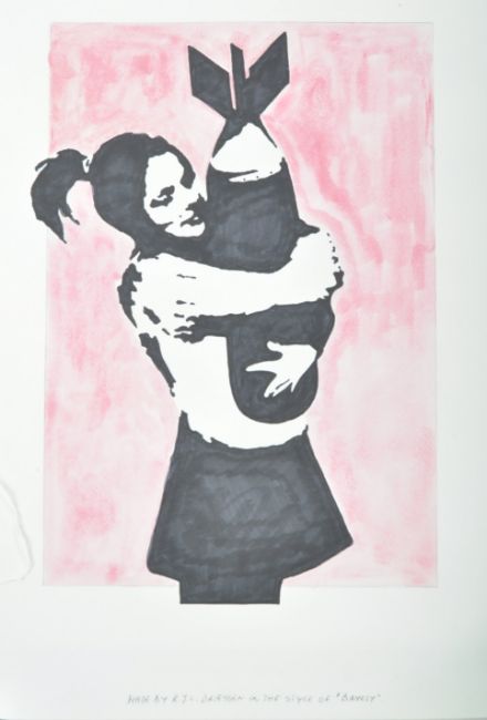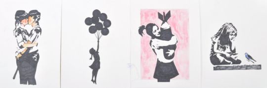Robert Driessen - Art Forger - Banksy - a collection of x4 original artworks by renowned forger Robert Driessen, all in the manner of Banksy. Largely ink on paper, and each signed to the lower edge by Driessen. Includes copies of Banksy's ' Kissing Coppers ,' ' Flying Balloon Girl ,' ' Bomb Hugger ,' and ' Girl With Blue Bird '.. Each 56x39cmRobert Driessen was born in Arnhem in the Netherlands. Like many artists he struggled to sell his own work, but found he could easily copy any other artists style. Over the last 20 years he became one of the most successful art forgers in the world. He has fooled museums, galleries and every major auction house. He came to specialise in the work of Alberto Giacometti. Robert emigrated to Thailand where he opened a small restaurant and moved away from the world of art. He has recently taken up the brush and sculptors tools once again, producing original reproductions, all of which are signed by Robert Driessen.
