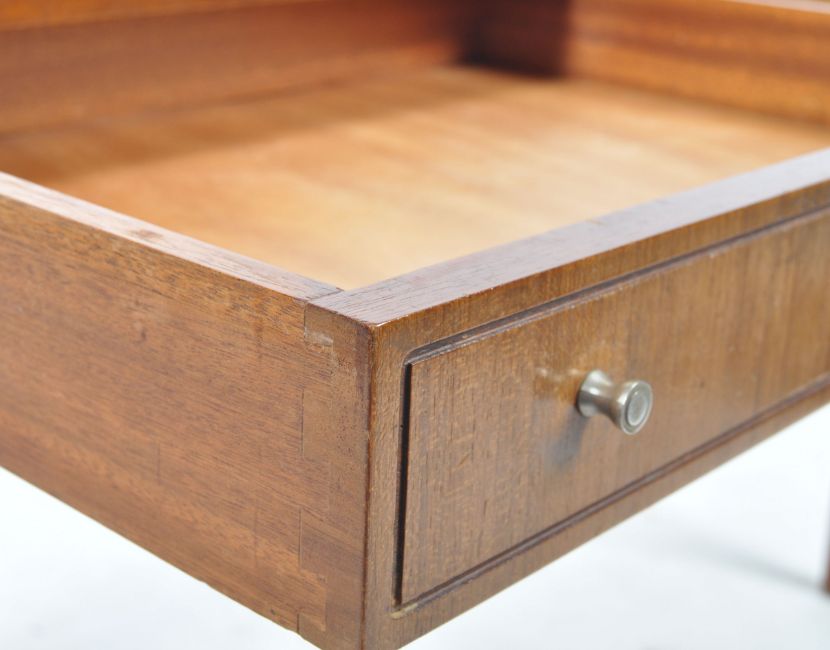 Walter Cornell - Greaves & Thomas Furniture - A vintage / retro 1960's Greaves & Thomas teak wood writing table - side table desk. The desk with a central bank of twin side by side drawers raised on tapering squared legs having a recessed frieze beneath the drawers. Measures approx 70cm x 117cm x 46cm.