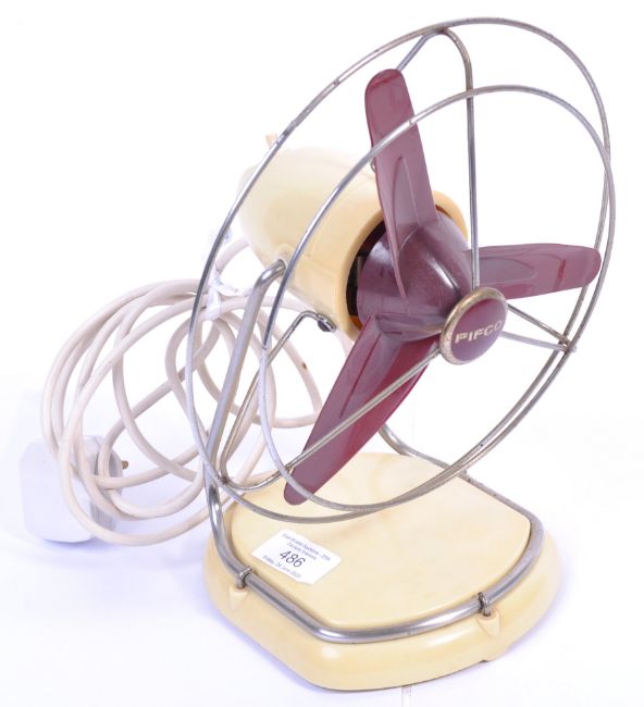 A retro mid century two tone colourway space age desk fan. In cream and burgundy with cage to fan. The terraced base with original paintwork. Measures