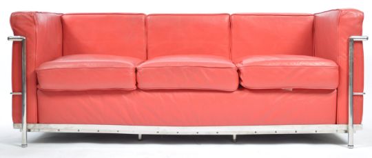 After Le Corbusier - LC2 - A good revival LC2 three seat club sofa settee having an exterior tubed chrome finished frame being upholstered in a red semi aniline leather upholstery complete with squab cushions. Measures 68cm x 180cm x 62cm