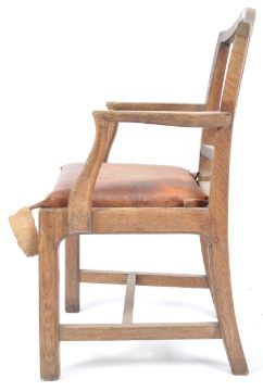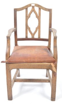 British Arts & Crafts Movement - Early 20th century arts & crafts movement carver armchair in the manner of Liberty & Co. The chair being raised on squared legs with stretchers having a drop in seat with s-shaped elbow rests having pierced lozenge back splat with arched top rail to the rear. Measures approx 97cm x 56cm x 50cm
