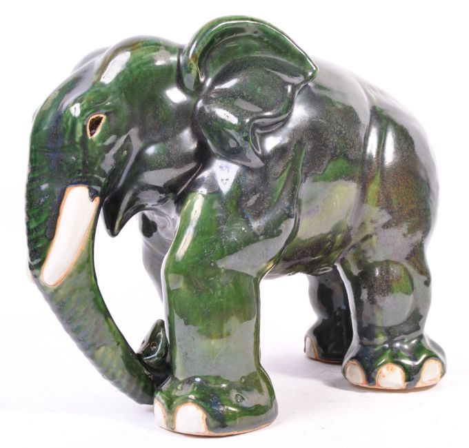 Yare Studio (believed) - An original retro vintage 1970's green glaze monochrome ceramic figurine of an elephant. The elephant finished in mottled green glaze. No makers marks. Measures 35cm tall.