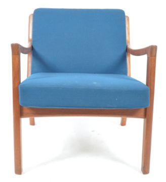 Ole Wanscher - France & Sons - Senator - Mid century Danish design ' Senator ' armchair in solid teak wood. Raised on shaped legs with angled and swept armrests with plain top rail back. Stamped to lower back splat. The chair upholstered with blue cushion. Measures 71cm x 63cm  x 70cm
