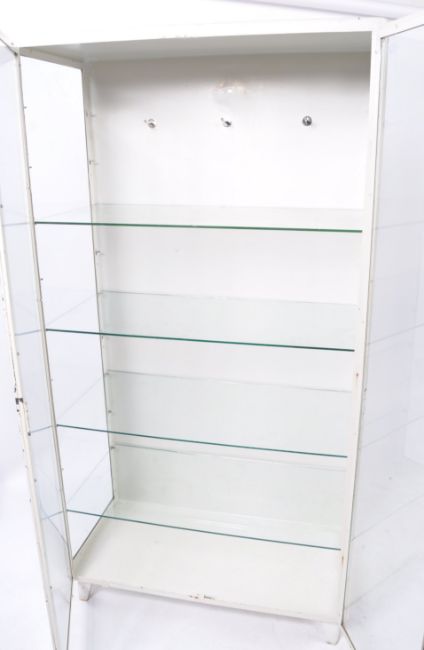 A mid century French Industrial / Medical  hospital cabinet of metal construction. The upright large cabinet in metal with believed original paintwork having central aluminium lock to the twin full length glazed doors housing glass shelves set within. All raised on metal tapering legs.