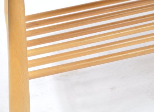 Lucian Ercolani - Erco; - Model 459 - A 20th century beech and elm blond wood rectangular Ercol Windsor pattern Model 459 coffee / occasional table being raised on turned legs with a spindle gallery magazine rack having a chamfered edge long john elm wood table top above. Measures: 37cm x 103cm x 46cm.