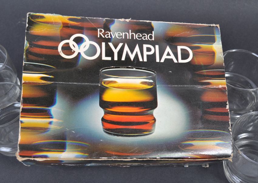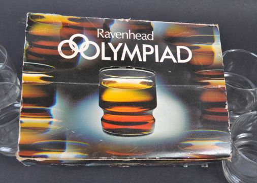 Ravenhead - Olympiad - A set of 6x English art glass tumblers / drinking glasses. The set by Ravenhead of Sunbury, England in the ' Olympiad ' pattern complete in the original box. Measures 7cm high each