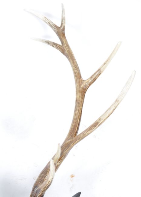 A lifesize fibreglass events / exhibition / advertising display statue of a mounted taxidermy style deer's head, with antlers. Painted in a bronze effect colourway, mounted upon a naturalistic fibreglass plaque. Incredibly well modelled and highly detailed. Removable antlers. Measures approx; 98 x 66 x 56cm, approx.