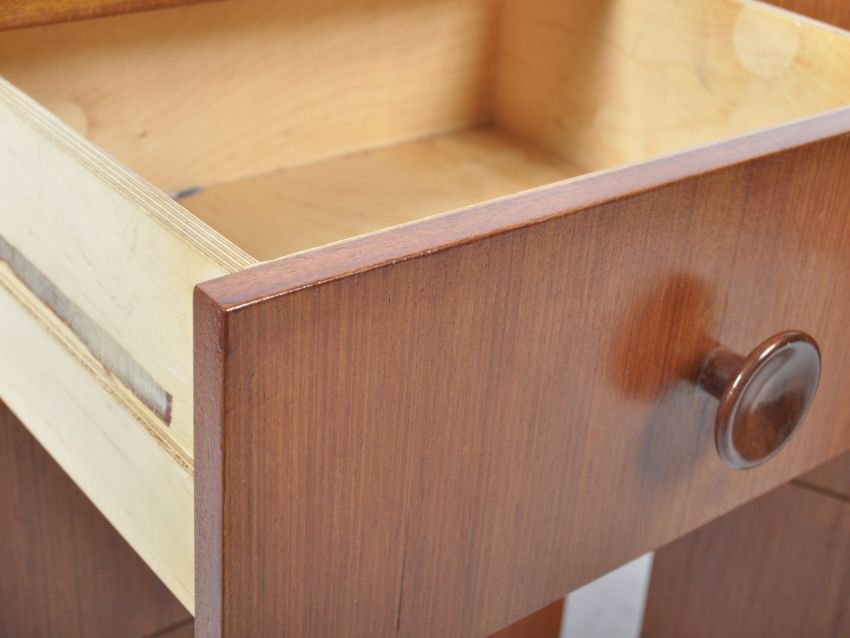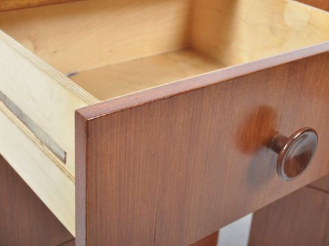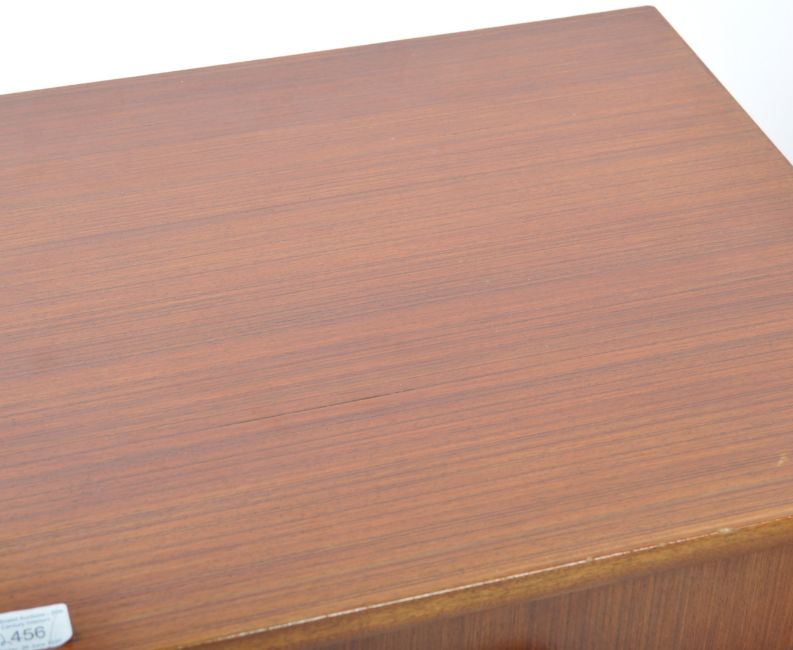 Meredew Furniture - An original 20th Century pair of upright  teak wood pedestal ' bedside '  chest of drawers. The chests being raised on a plinth base with an upright bank of 4 drawers having turned knob shaped  handles  to the centre. Flared table top above, original back panel in place. Measures approx; 77x45x41cm