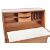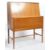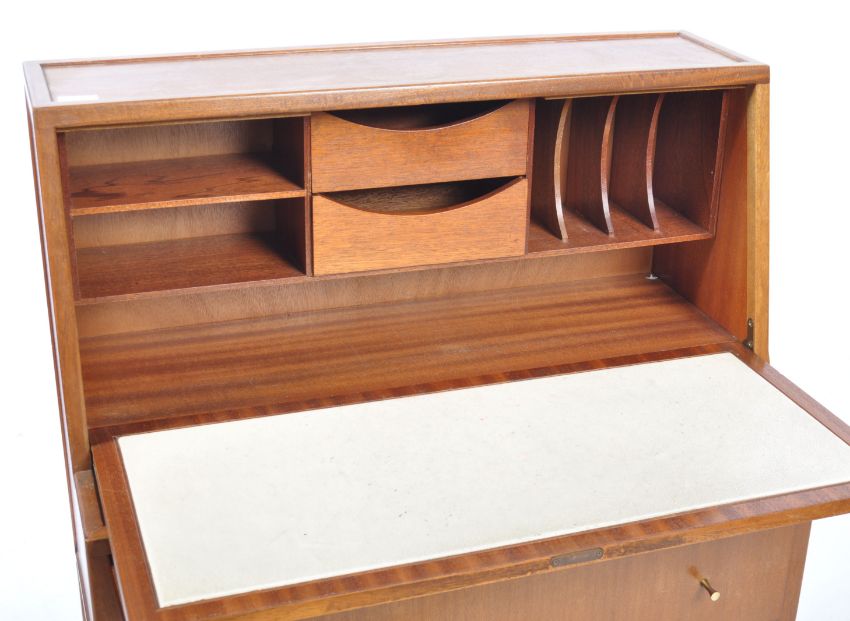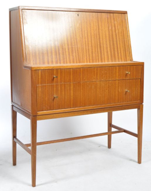 An original retro vintage mid 20th century retro teak wood secretary ( bureau - desk ) being raised on square tapering legs united by stretchers. Above, a bank of two deep graduating drawers with brass pull handles beneath a fall front bureau with appointed interior set within. Measures approx 107cm x 81cm x 41cm