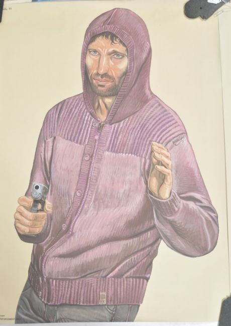 PJL Targets - Malik - Massoz printed - A set of four 20th century Belgian / Flemish police firing range shooting target posters, each poster featuring an armed man with hand gun in a variety of poses . Posters designed by Malik and printed by Massoz. Print to bottom ' For Law Enforcement Only '.