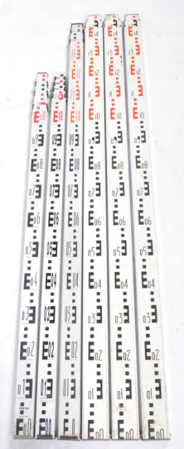 A collection of retro vintage 20th century wooden three section extending surveyors measures with metal fittings. Each with extending measured facia in black and red, in the manner of Stanley, London. Measures 154cm when closed