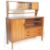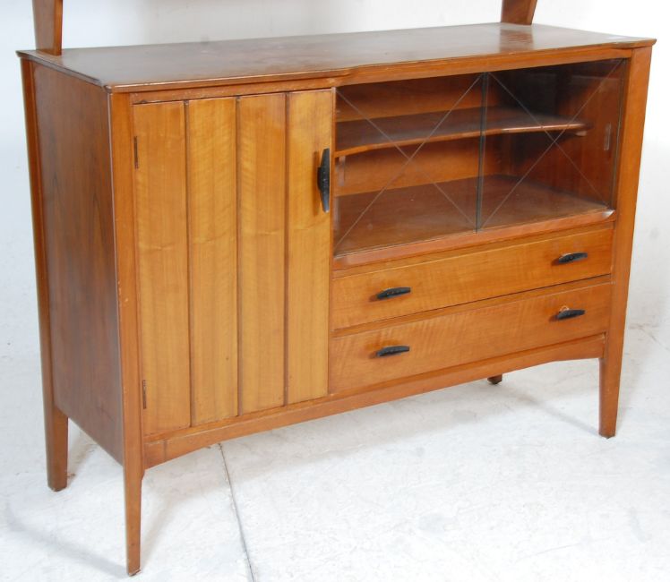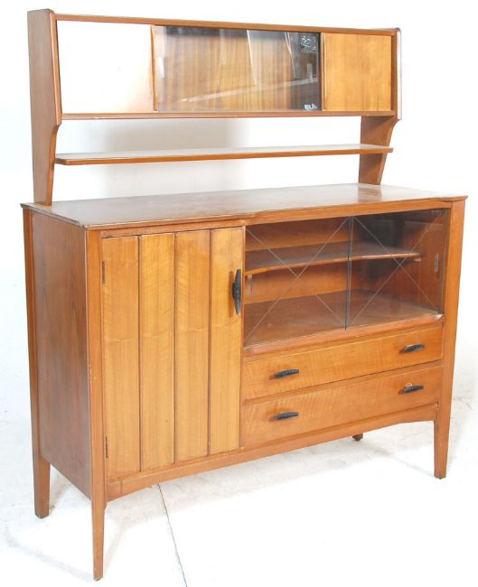 A retro British mid 20th century design teak wood sideboard credenza. The base being raised on shaped supports having a series of drawers, cupboard and glass cabinet to the base. Above, a raised upright highboard with glass cabinet and cupboards over suspended open window shelf centre.