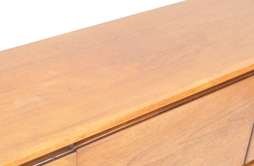 White & Newton - A 20th century retro teak wood credenza sideboard having a bank of three graduating drawers flanked by two single door cupboards. Blind fronted with recessed upper drawer fronts and doors for handles. All raised on angled legs with returns. Measures 70 x 217 x 45cm, approx.