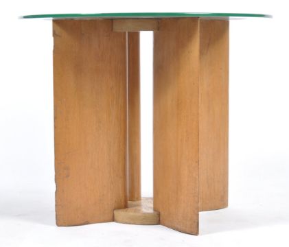 Manner of Epstein Brothers - A 1930's Art Deco mirror glass and oak side / occasional lamp table. Of pedestal form having a circular mirror glass top over 4  oak keel shaped uprights united with a circular plinth to centre.  Measures 61cm x 76cm