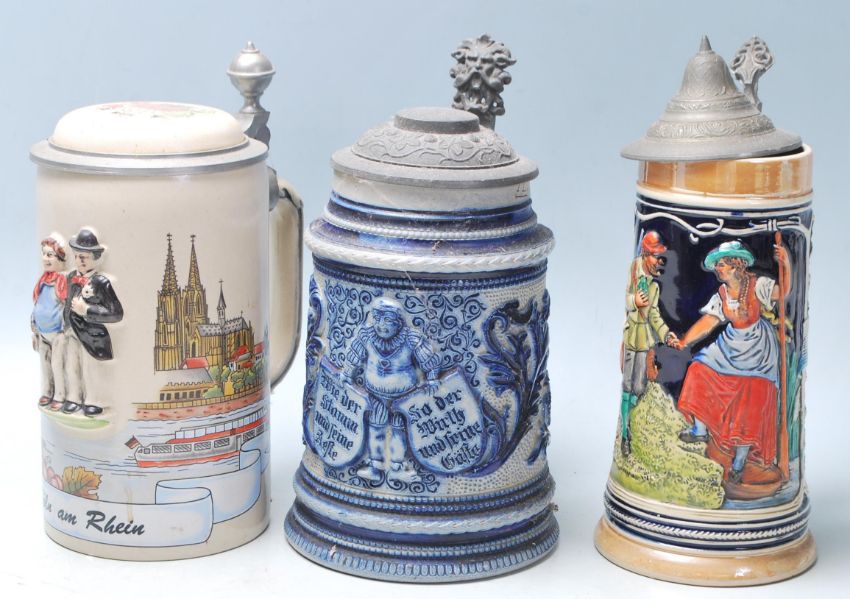 A large collection of German blue and grey stoneware jugs and beer steins, some having pewter lids, all having intricate raised decoration ot the sides , also includes some wine vessels with grape vine decoration, a range of ages and styles.