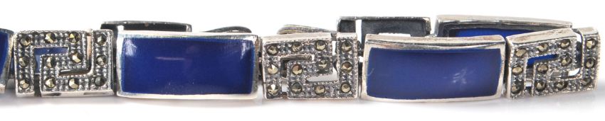 An Art Deco style silver ladies bracelet having marcasite and lapis lazuli decoration. Measure 18cm long. Weighs 15g.