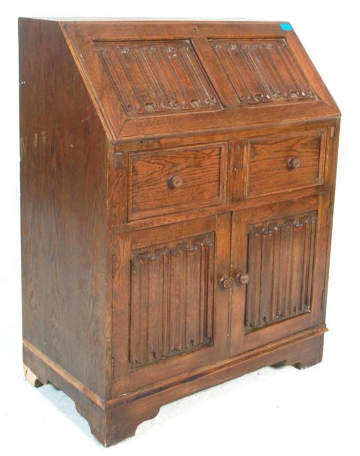 A Jacobean revival 1930's oak bureau decorated with linen fold motif having a fall front desk to reveal a sectional interior above a single drawer with turned handles and double door cupboard raised on bracket feet. Measures 100 x 76 x 44 cm.