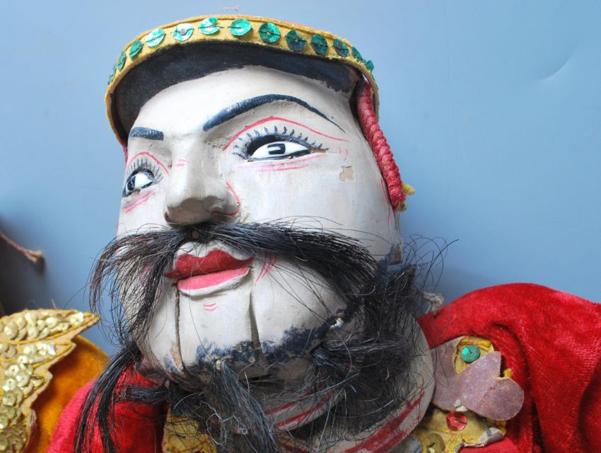 A group of four vintage puppet dolls to include a pair of Thai / oriental dolls having wooden construction with colourful  fabric cloth, The Original Gooney Bird by Toyway, and a puppet doll dress as a joker with wooden construction. Measures 50cm long.