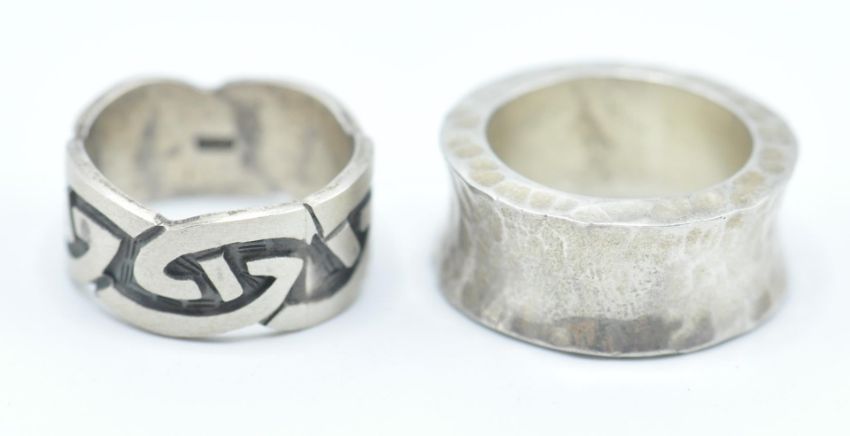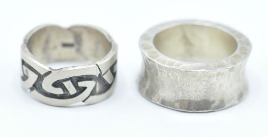 A collection of five gentleman's silver rings to include a celtic knot style ring, a large hammered design ring, a brushed effect ring with black enamelled stripes, a ring set with white stones, and a square shaped ring. All marked 925. Total weight 74.6g.
