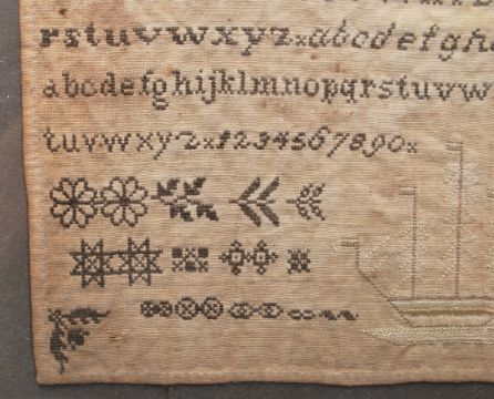 A 19th Century Victorian needlework / needlepoint embroidery sampler stitched with the alphabet, florals, ships and the bible and set within a wooden frame.