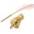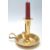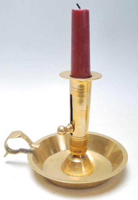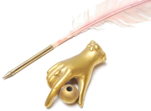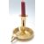 A mid 20th century vintage brass tidy items to include a feather quill ballpoint pen with a heavy brass stand in a shape of the hand together with a Georgian style brass candle holder raised on a circular tray with adjustable candle slider. Measures 12cm tall.