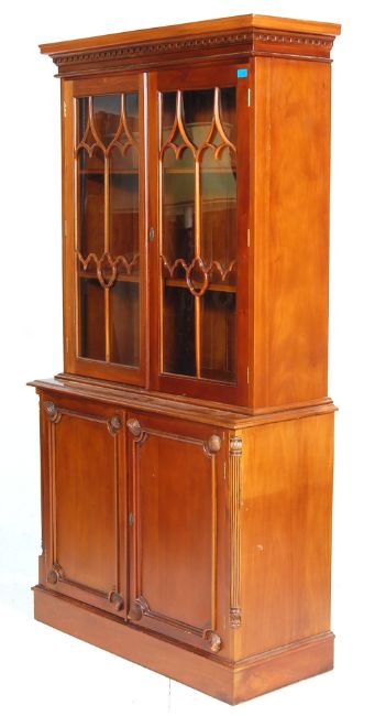 A good George III revival 20th century mahogany library bookcase cabinet having a carved frieze top above two shelves behind twin glazed doors, the base having twin doors opening to reveal further shelves within, the panelled doors having carved shell decoration, all raised on a plinth base. Measures 205 x 100 x 48