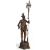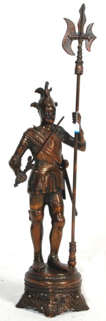 An large 20th century cast metal Wellington statue depicting a medieval soldier holding a sword to the right hand and a spear to the left sitting on circular base with pierced detailing, finished in a bronze effect. Measure: 113cm tall.