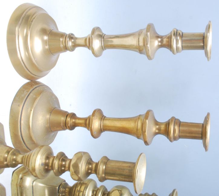 An early 20th / late 19th Century set of six tabletop brass candlesticks being raised on a squared base with tapering columns and singles sconces. Measures: 30cm high.