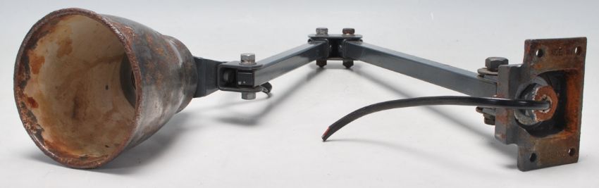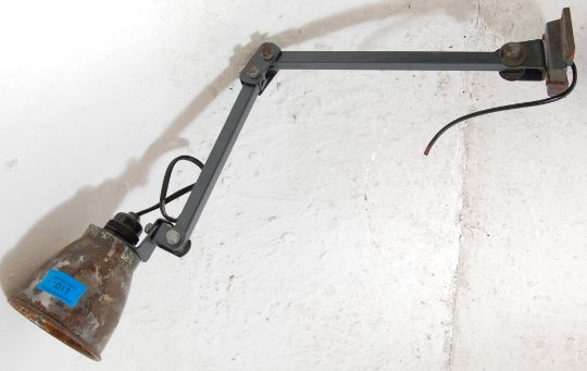 A vintage retro mid 20th Century Industral Blok Light type  wall mounting Factory workshop type anglepoise lamp / light having an ebonised adjustable arm with square wall bracket to the base and cylindrical shade.