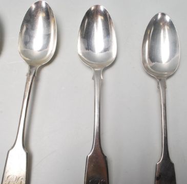 A collection of five 19th century Victorian silver serving spoons dated London 1841 and 1842 Robert Williams, 1851and two 1840 Samuel Hayne & Dudley Cater. Weight: 342g. Measures 23cm long.