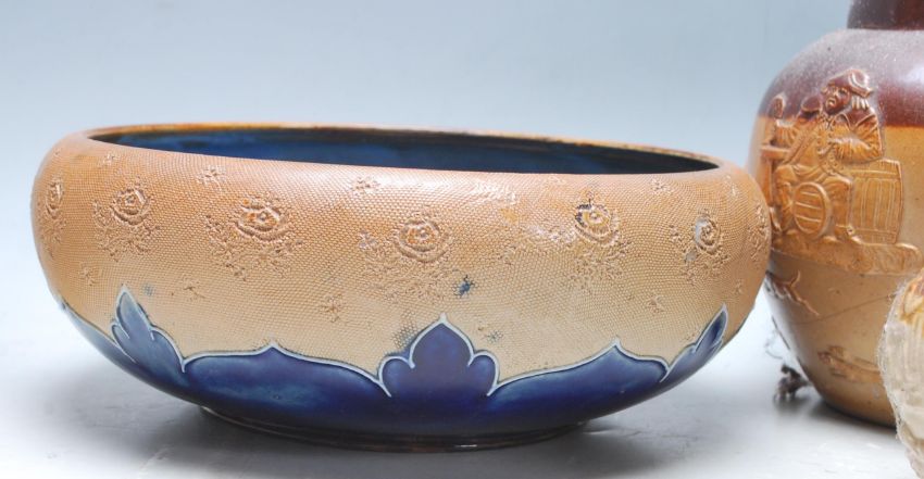 A collection of 19th century Doulton Lambeth stoneware jugs having raised tavern and hunting scenes decoration with salt glaze decoration and brown band at the top. Height measures 20cm.
