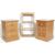 A pair of antique style country  pine bedside pedestal chests of drawers - cabinets. Each having a shaped edge over three drawers with turned handles raised on a plinth base together with a pine shelf unit comprising of a shaped hooded top over three shelves. Measures 78 cm high x 158 cm wide x 78 cm deep.